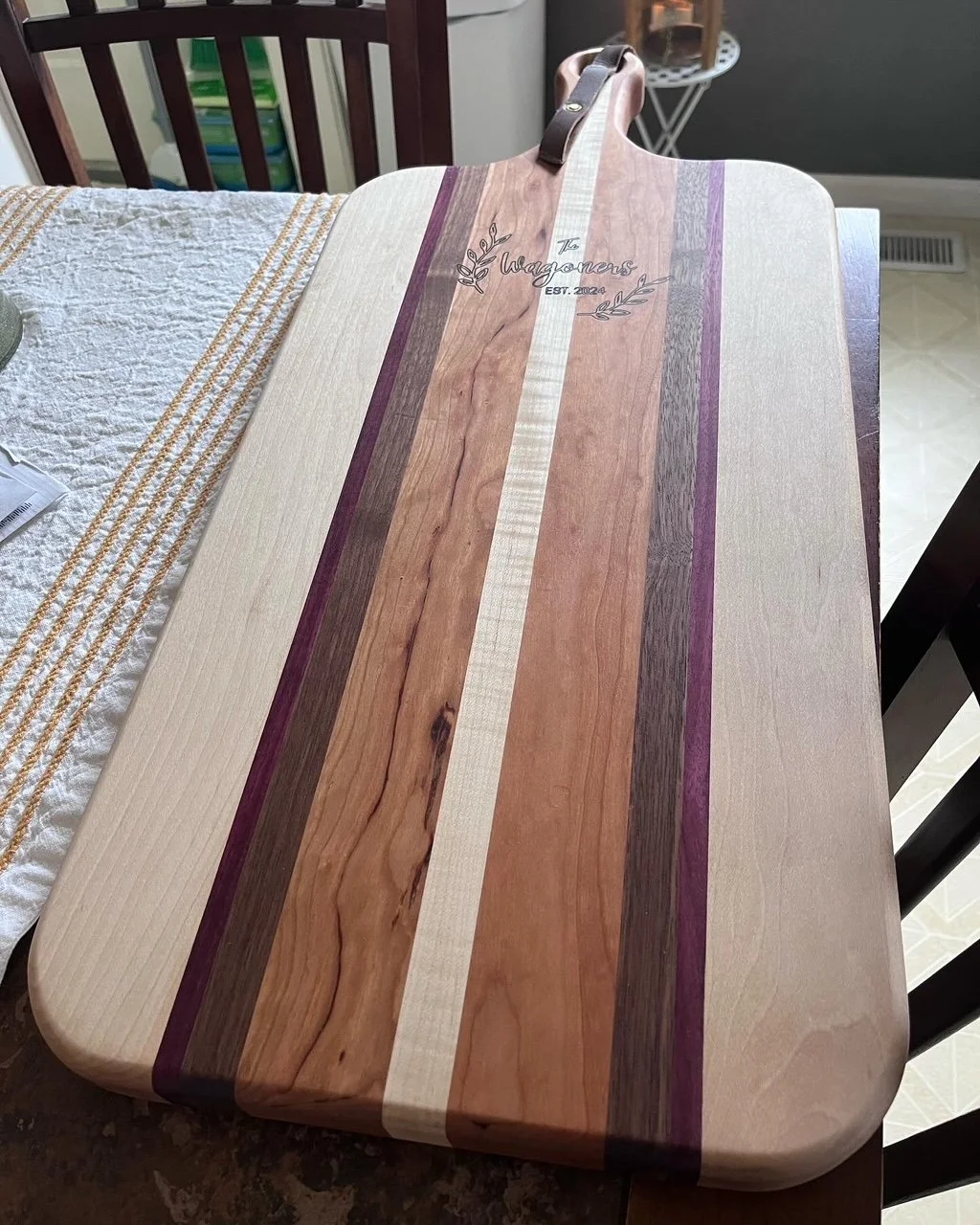 “I received this beautiful cutting board as a bridal shower gift and I loved it so much I actually have it hanging on display in my home. The craftsmanship, color, attention to detail, all of it is a masterpiece. I’ll be cherishing this for life. ”